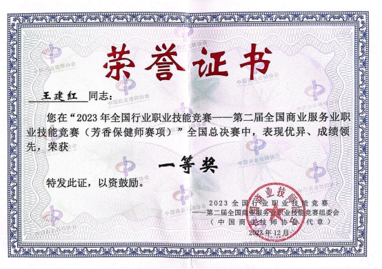 芳香保健师赛项总决赛由中国商业技师协会、中国就业培训技术指导中心、中国财贸轻纺烟草工会全国委员会联合主办,河北雄安新区公共服务局、北京市成人按摩职业技能培训学校共同承办的,来自全国22个赛区230名选手同台竞技,王建红老师赛前积极备赛,赛场沉着应战,经过近2天的激烈比拼,最终获得全国第五名,一等奖的好成绩。