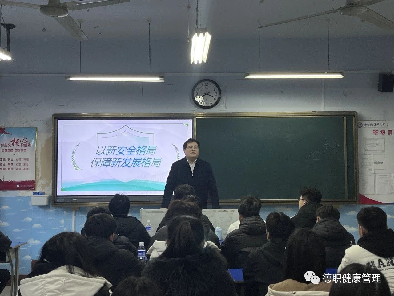 随后,朱弘主任深入联系班级,围绕《以新安全格局保障新发展格局》这一主题,为同学们上了一堂精彩的“形势与政策”课。首先,朱弘主任以解放军军帽故事作为切入点,指出国家安全是民族复兴的根基,社会稳定是国家强盛的前提。随后,他从保证国家安全是头等大事、必须坚持总体国家安全观、开创国家安全工作新局面三个方面阐述并论证了国家以新安全格局,保障新发展格局的重要性。