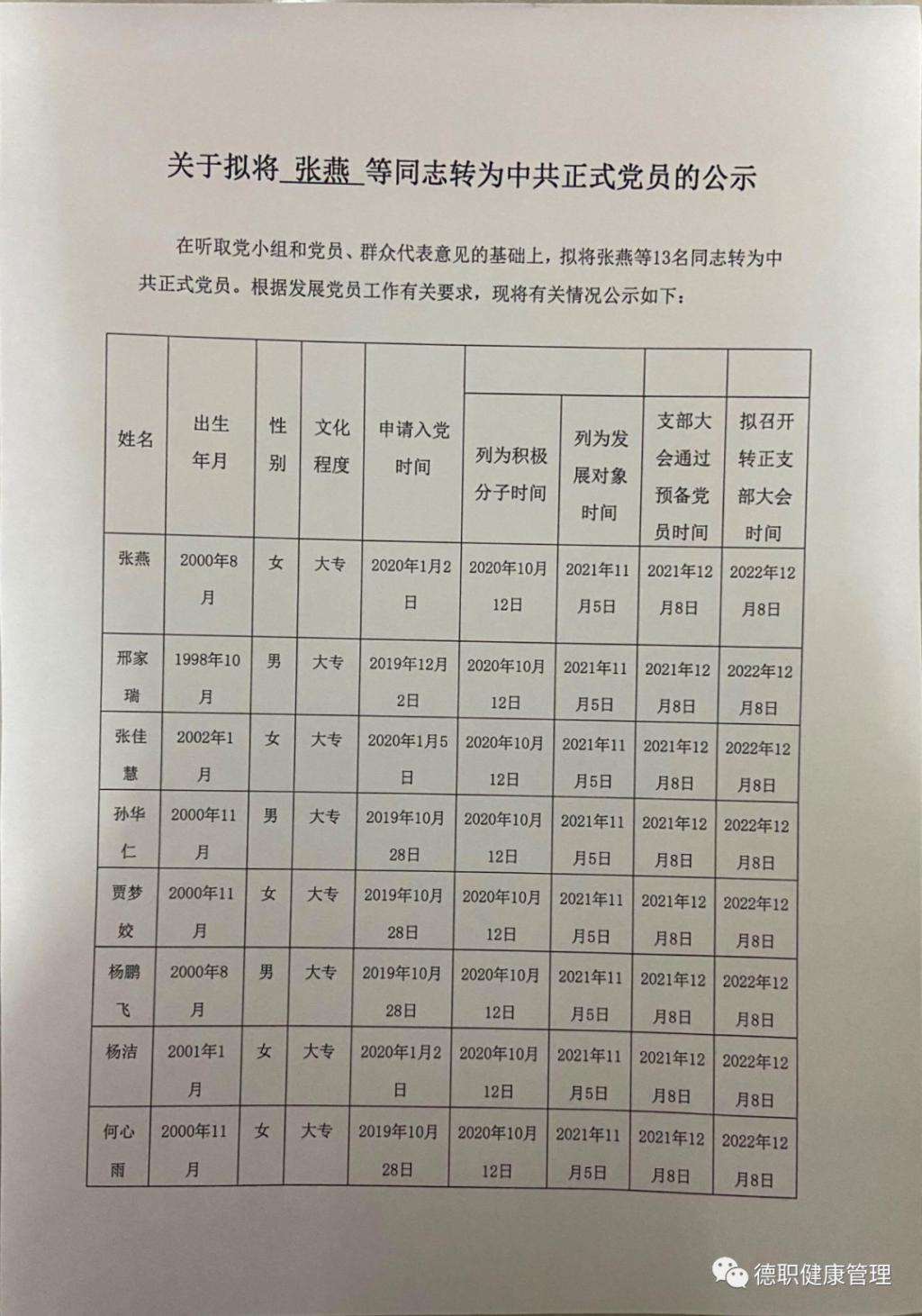 在听取党小组和党员、群众代表意见的基础上,拟将张燕等13名同志转为中共正式党员。根据发展党员工作有关要求,现将有关情况公示如下: