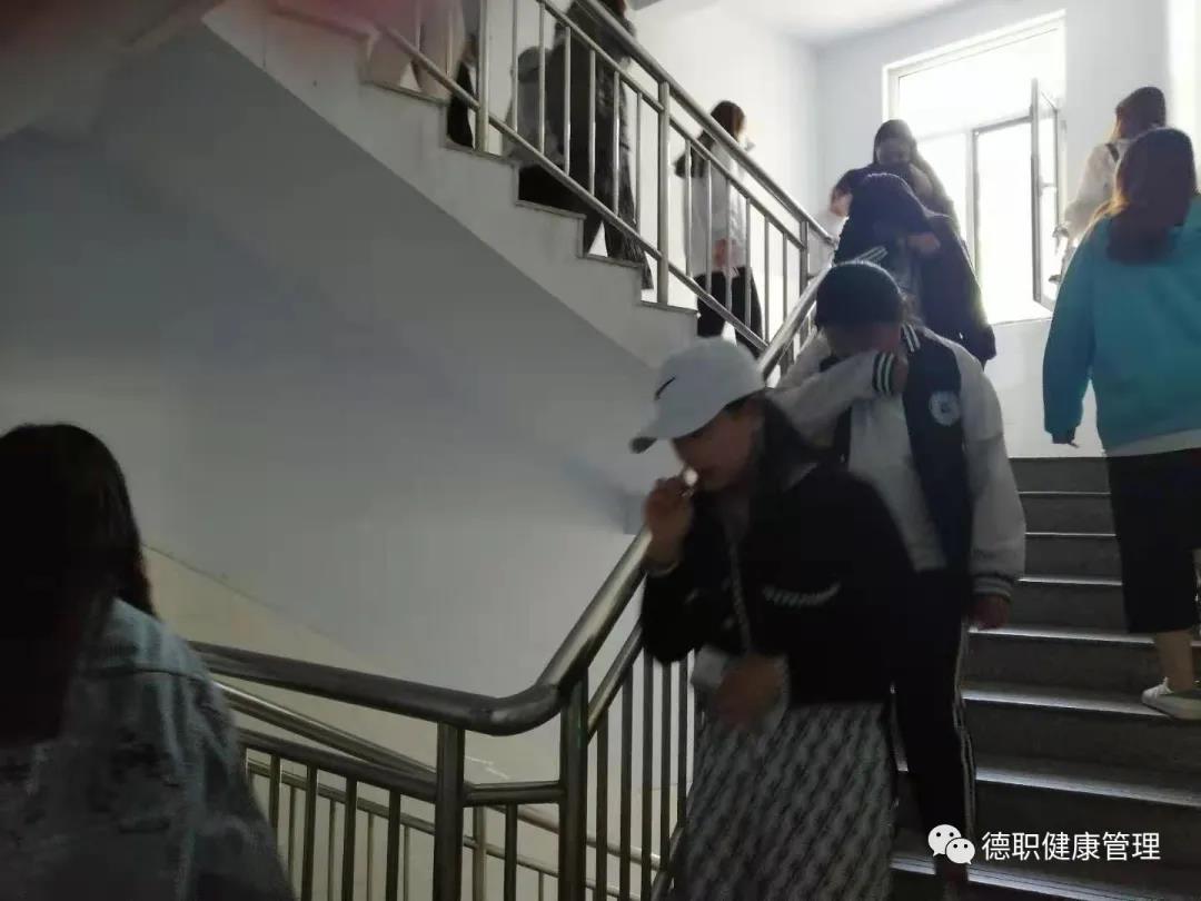在演练过程中,随着信号的发出。同学们在张晓雨同学的组织带领下,根据演练方案中规定的路线,弯着腰,捂住口鼻,沿着指定楼梯口快速疏散,有序地撤离到宿舍的安全地带,同学们在最短的时间内到达的指定位置,整个疏散演练过程井然有序。