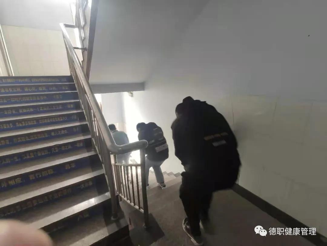 演练开始,学生们迅速从安全通道口撤离。只见他们一个个表情严肃,用湿毛巾捂住口鼻,迅速而有序的从通道口撤离“火灾”现场,有序的离开3号楼,迅速到达安全场地集合。
