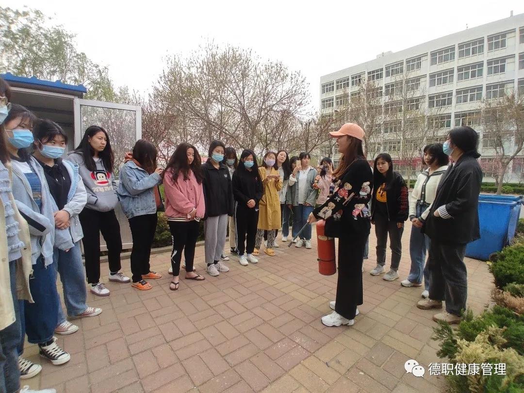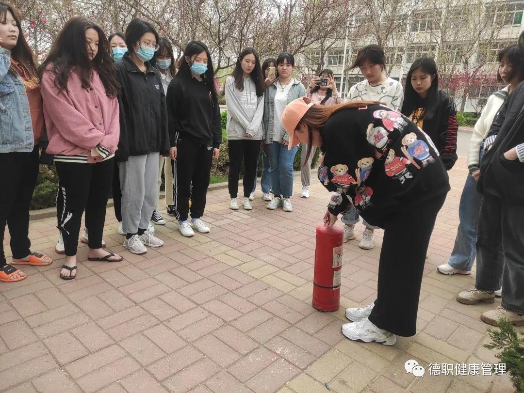 疏散完毕后学生们站在灭火器前,由宿管部部长杨洁为代表给大家讲解遇到火灾的处理方法,并亲自演示消防器械的正确使用方法。整场演练过程安排严密紧凑,人员组织紧张有序。