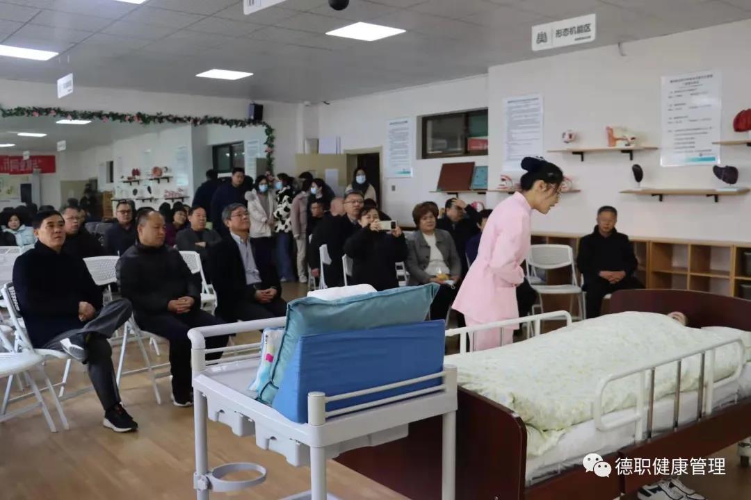 接着,通过视频形式向观摩团的领导和老师们展示介绍了校企共同投资建设的校外产教融合实训室建设情况。王倩老师重点讲解了老人居室样板间和“智慧康养区”设备。老人居室样板间是按照养老机构中的标准1:1打造,同时增加了一键呼叫器、烟感器、门磁、人体红外感应仪等智能设备,用于学生的仿真教学和技能大赛的模拟训练。“智慧康养区”购置了肢体评估康复运动系统设备,它可以利用物联网+实现“评估、康复、干预”三合一的个性化健康服务,真正实现智能居家养老。最后,由健康评估人员和模特通过“蜜蜂采蜜”“弹钢琴”两项游戏,模拟演示了“老人关节活动度评估康复训练项目”。