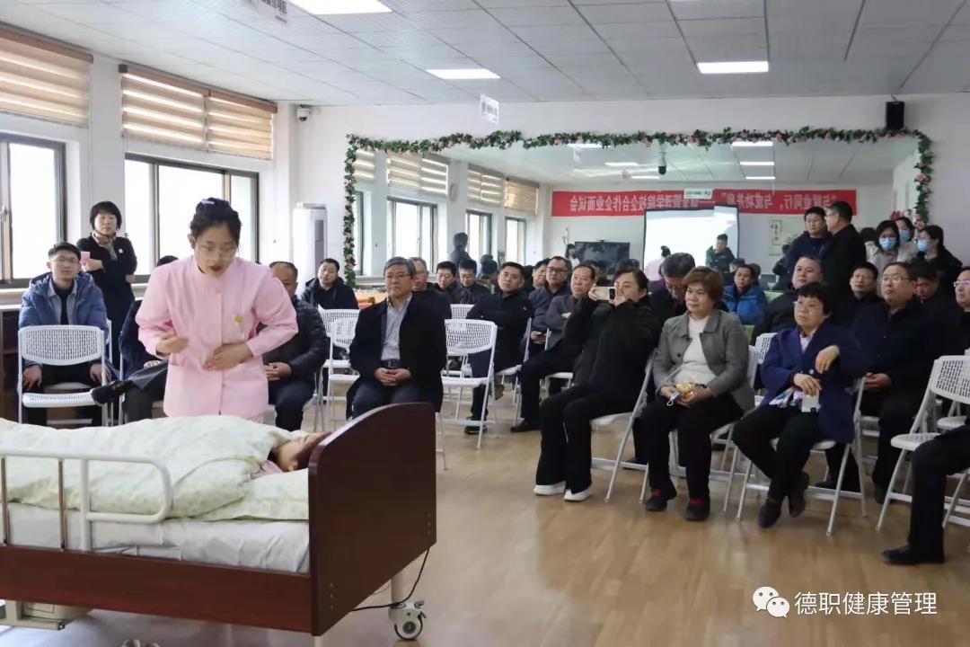 最后,刘斐斐老师介绍了米乐mile体育官网一年来的亮点工作和技能大赛取得的成绩,指导获得省“技能兴鲁”健康照护赛项二等奖的吕莲莲同学进行“协助偏瘫老人进行床上翻身训练”的演示汇报,现场观摩团的领导和老师们认真观看,跟随汇报的同学一起模拟,大家表示这样贴近生活实际的技能非常有推广的价值。