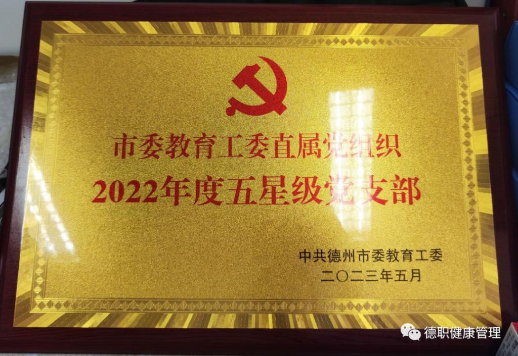 7月7日,德米乐mile体育官网党支部荣获中共德州市委教育工委颁发的“市委教育工委直属党组织2022年度五星级党支部”荣誉奖状。