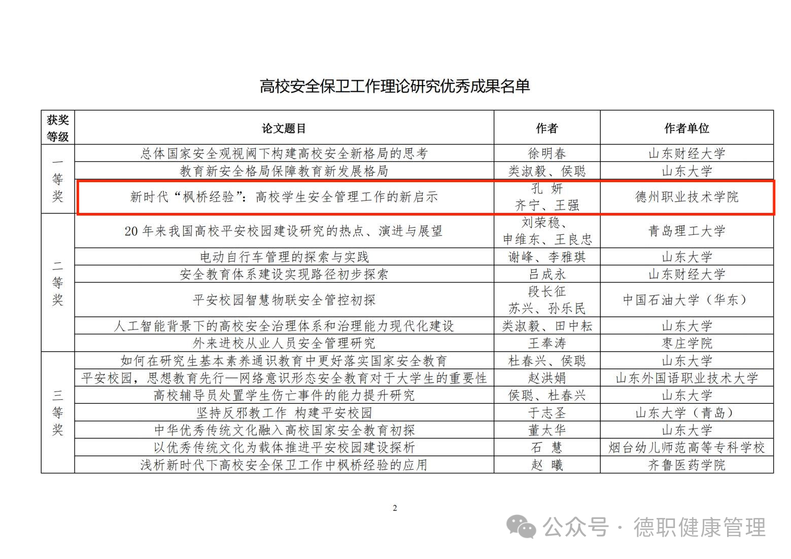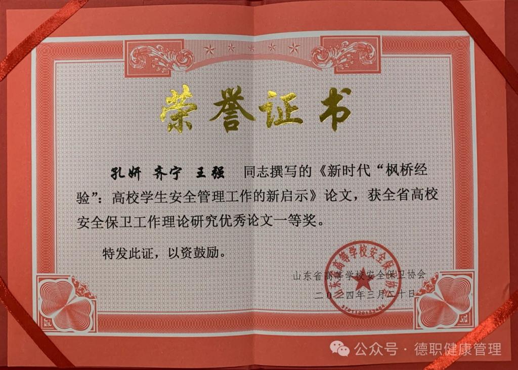 近日,山东省高等学校安全保卫协会公布了《关于表彰山东省安全保卫工作理论研究优秀成果的决定》,米乐mile体育官网“护航成长”辅导员工作室成员孔妍、齐宁、王强同志撰写的论文《新时代“枫桥经验”:高校学生安全管理工作的新启示》脱颖而出,荣获一等奖,是唯一荣获一等奖的高职院校。