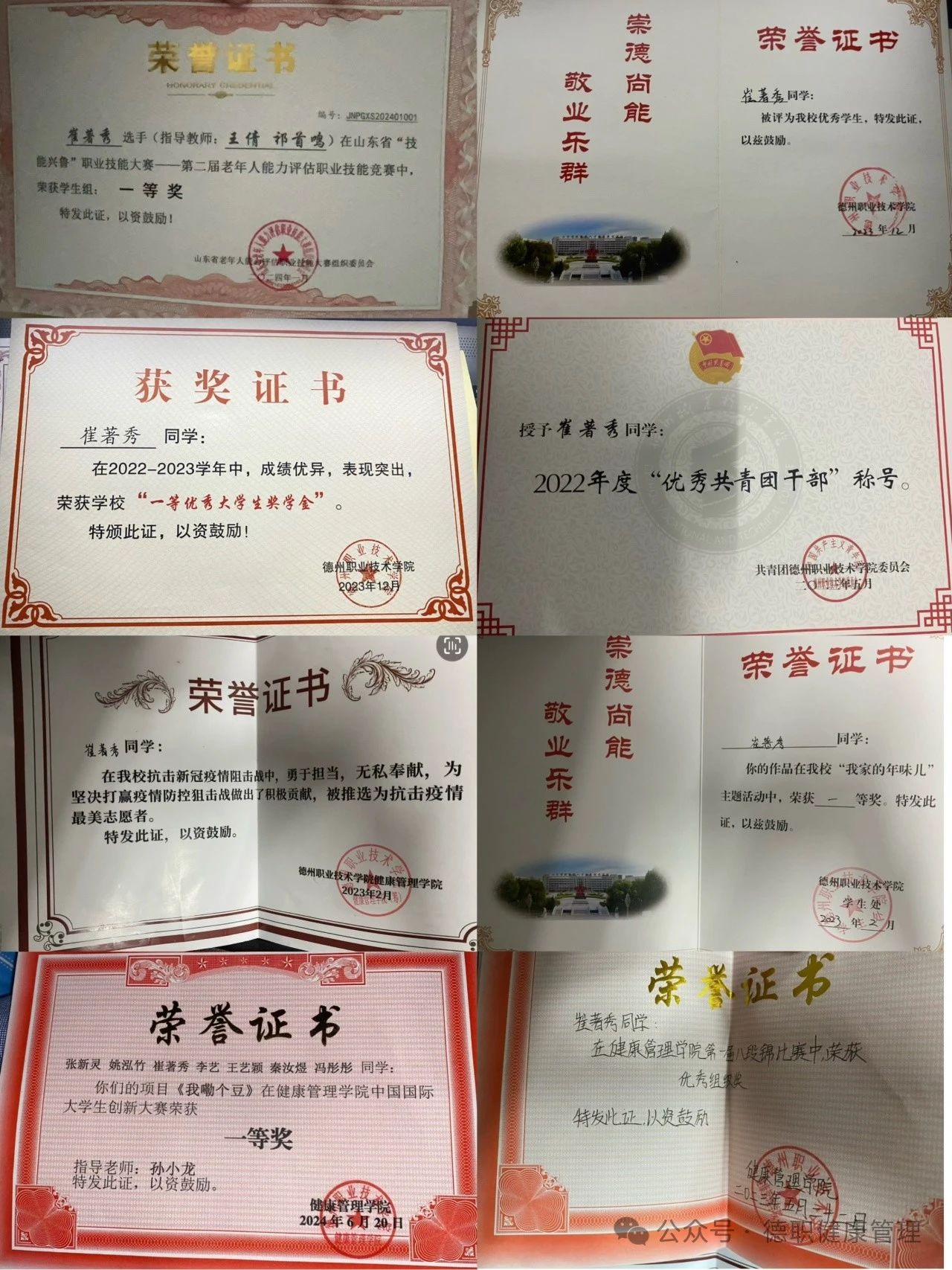 崔著秀,女,汉族,山东省潍坊市潍城区人,2004年2月出生,现任2022级智慧健康养老服务与管理三班团支书。2023年3月被推选为入党积极分子,经党组织的培养考察,2024年5月被列为发展对象,并于2024年6月成为预备党员。