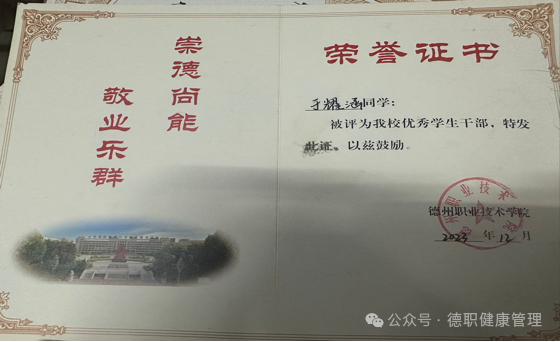 于耀涵自2022年入学以来,在思想上,积极向党组织靠拢,热爱祖国,坚决拥护中国共产党的领导和社会主义制度,有良好的道德修养。在班级管理方面,团结同学,乐于助人,积极配合老师们的工作。在生活方面,实事求是,关心集体,积极参与各项公益活动,勇于批评与自我批评,树立了正确的人生观和价值观。