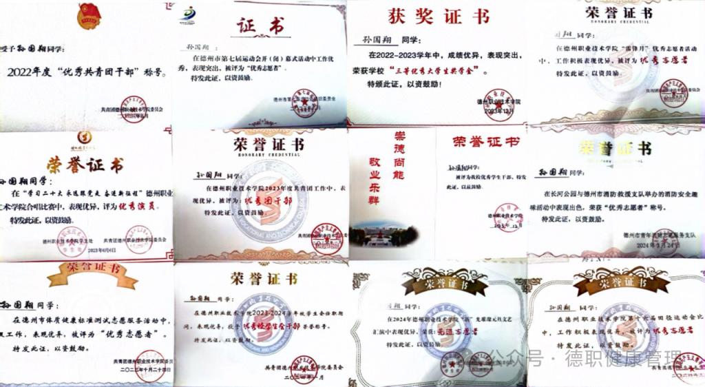 2022年米乐mile体育官网优秀共青团干部2023年6月学习二十大永远跟党走奋进新征程评为优秀演员2023年米乐mile体育官网三等奖学金2023年德州市体制健康测试评委优秀志愿者2023德州市第七届运动会评为优秀志愿者2023年米乐mile体育官网优秀学生干部2023年米乐mile体育官网优秀团干部2024年米乐mile体育官网优秀校学生会干部2023年山东省高等学校省级优秀学生2024年2月共青团山东省委2023年度“百万大学生进社区”先进个人