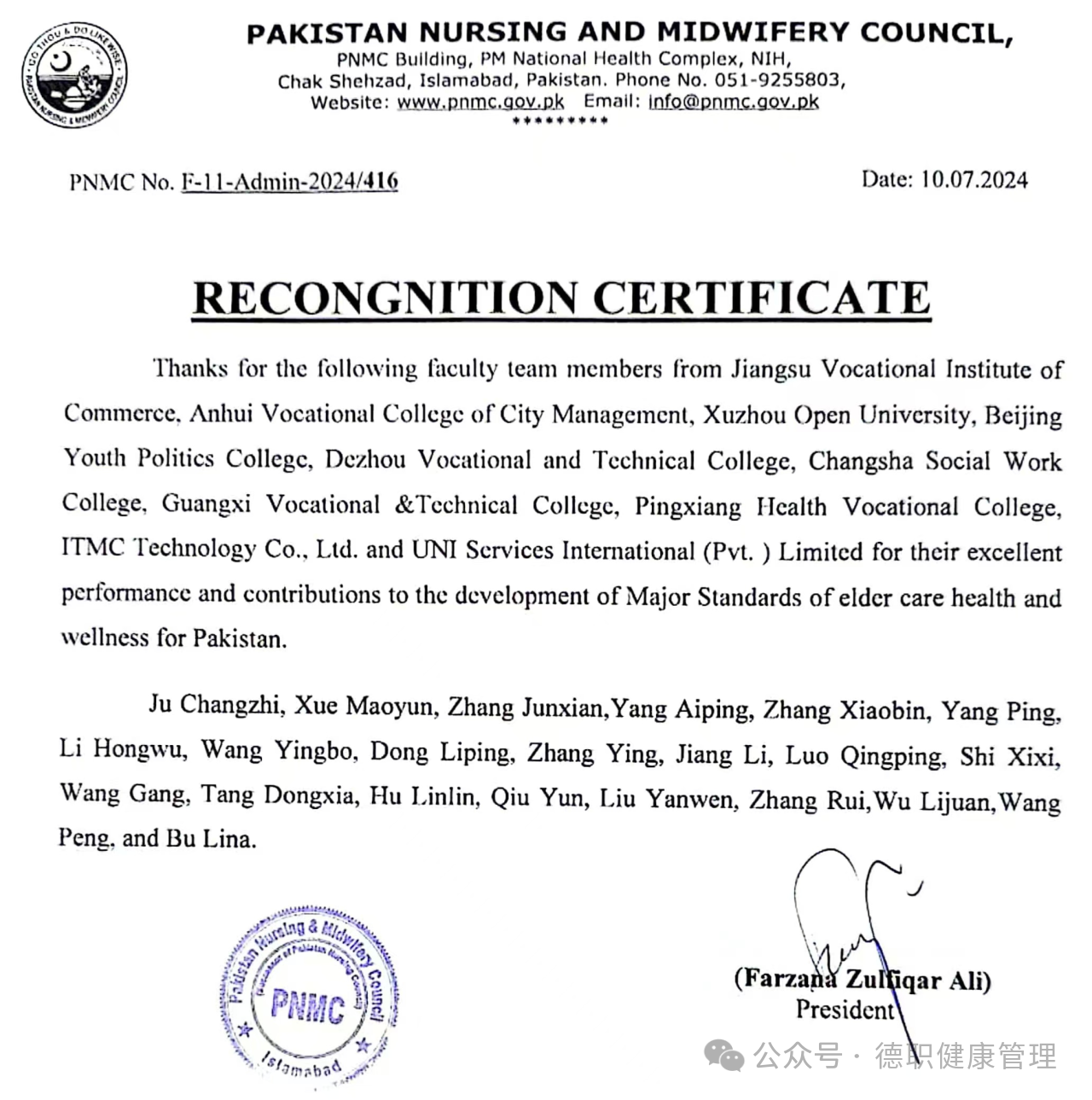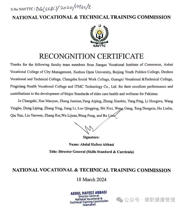 近日,米乐mile体育官网智慧养老专业教师参与制定的“巴基斯坦老年照护专业标准开发项目”获得巴基斯坦老年照护专业标准国家职教委认证和巴基斯坦卫生部助产与护理委员会认证。
