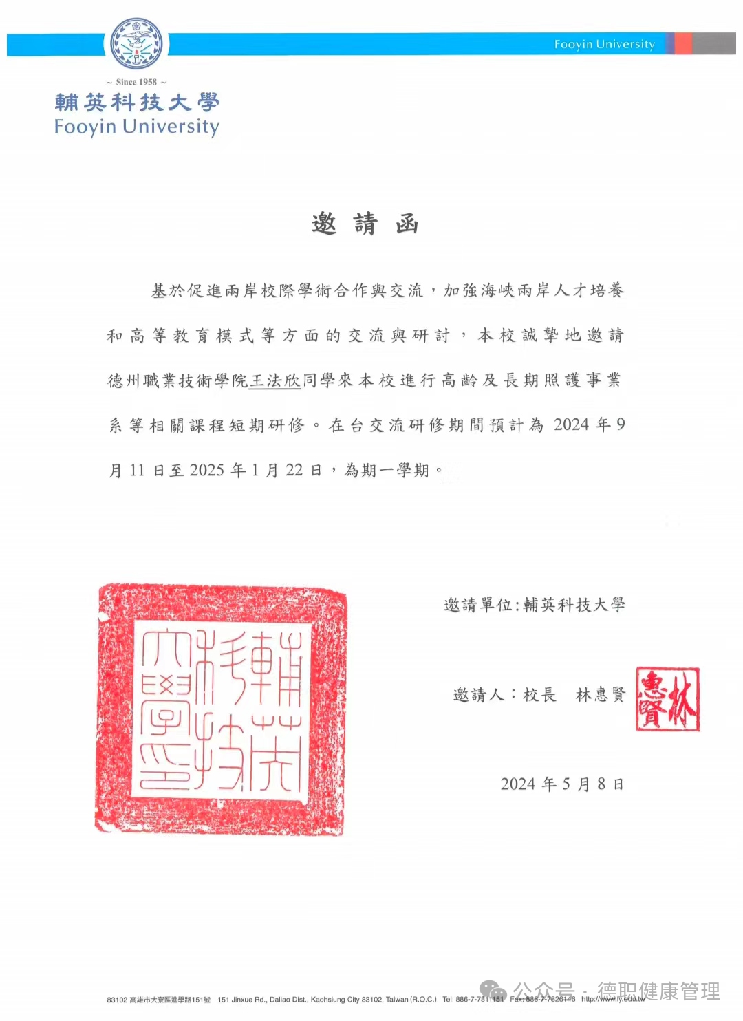 为深化海峡两岸高校间的学术交流与合作,增进两岸在人才培养及高等教育模式方面的相互学习与探讨,辅英科技大学国际暨两岸交流中心主任叶金麟先生于2023年10月到米乐mile体育官网进行访问。叶金麟主任表达了期望与米乐mile体育官网在学生短期研修、教师互访等多方面开展深入合作交流的愿景。对此,米乐mile体育官网做出积极回应,选派2023级智慧健康养老服务与管理专业学生王法欣同学,前往辅英科技大学进行为期一学期的研修活动。