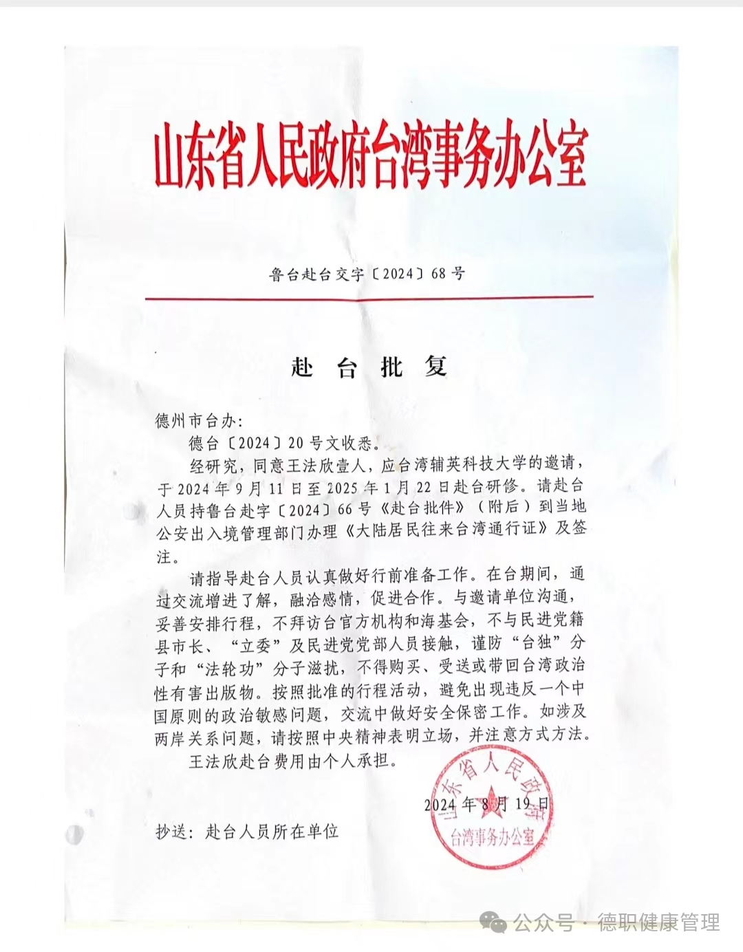 米乐mile体育官网一直致力于为学生提供多元化的学习机会,鼓励学生走出校园,拓宽视野,提升综合素质。学院对此项交流活动予以高度重视,积极协调对接课程内容,并在山东省人民政府台湾事务办公室的正式批复下,为王法欣同学顺利完成了赴台手续,对其行程安排、学习计划以及生活保障等各方面都进行了细致考虑和周密安排。此次王法欣同学的赴台交流学习,正是米乐mile体育官网国际化教育战略的具体体现。