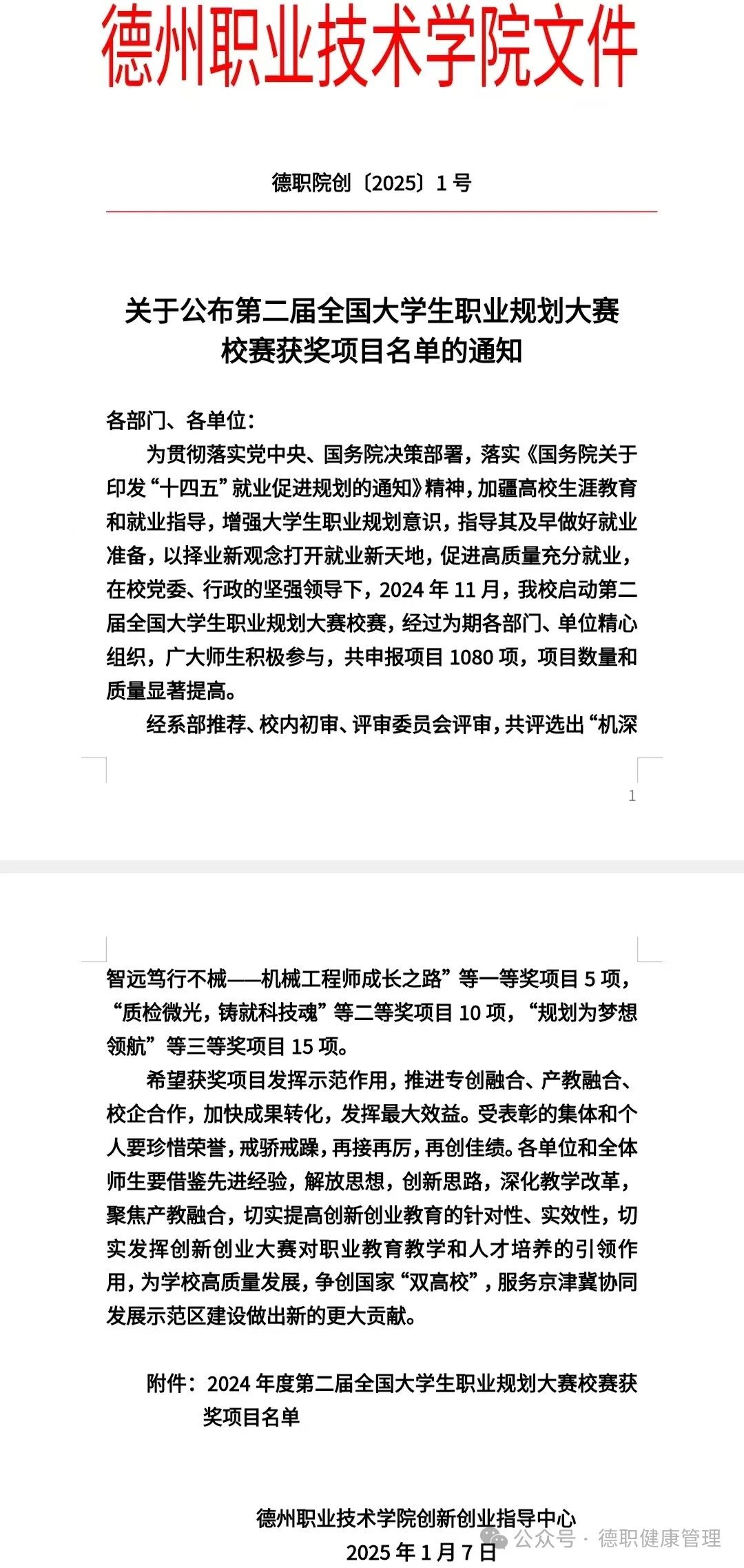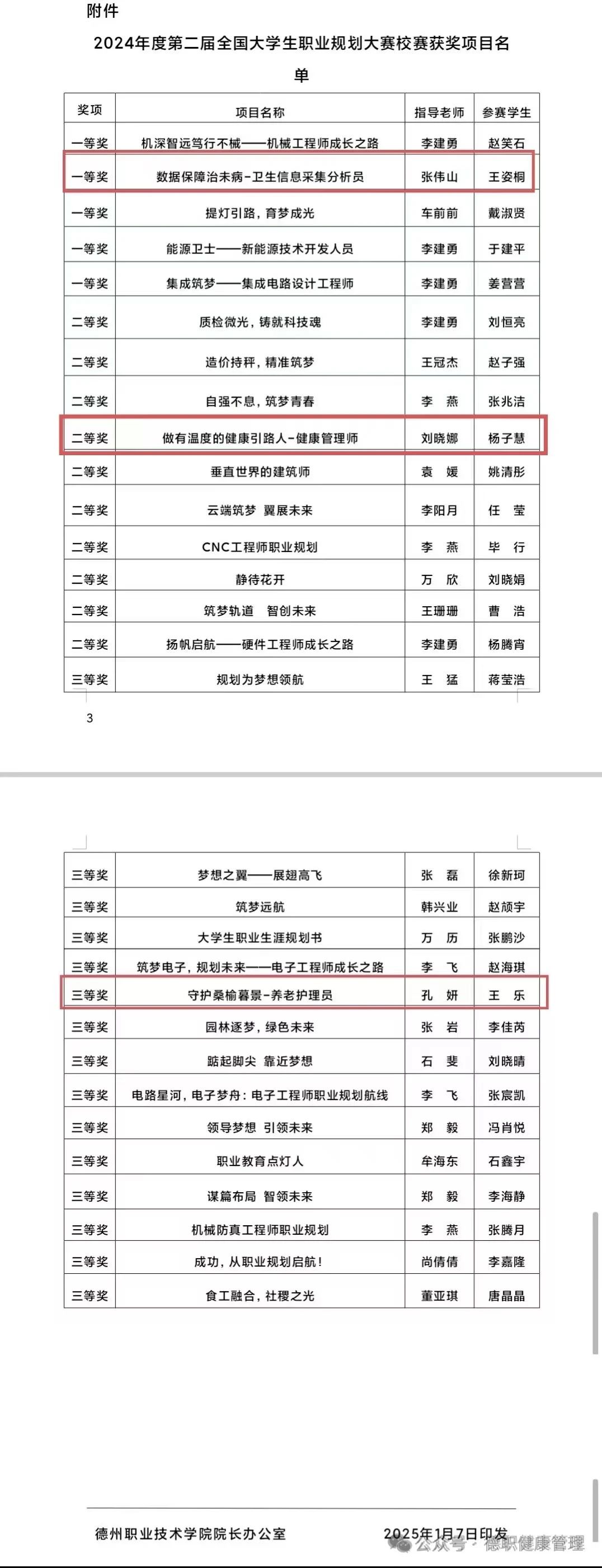 2025年1月7日,米乐mile体育官网公布了第二届全国大学生职业规划大赛校赛获奖项目名单,米乐mile体育官网2024级大数据管理与服务一班王姿桐荣获一等奖、2024级健康管理一班杨子慧荣获二等奖、2023级智慧健康养老服务与管理一班王乐荣获三等奖。