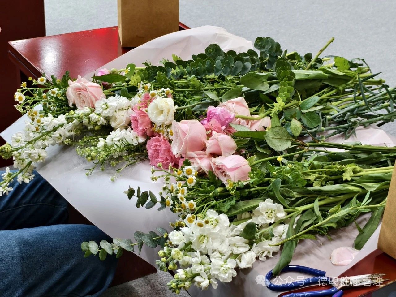 现场花香四溢,气氛热烈而温馨。本次活动为老师们提供了雪山玫瑰、洋桔梗、康乃馨、小雏菊等多种花材,专业花艺师首先为大家介绍了插花的基本技巧与花卉养护知识,随后引导教职工们动手创作属于自己的花艺作品。教职工们兴趣盎然,边学边做,不时与邻座的同事交流心得,互相欣赏作品。