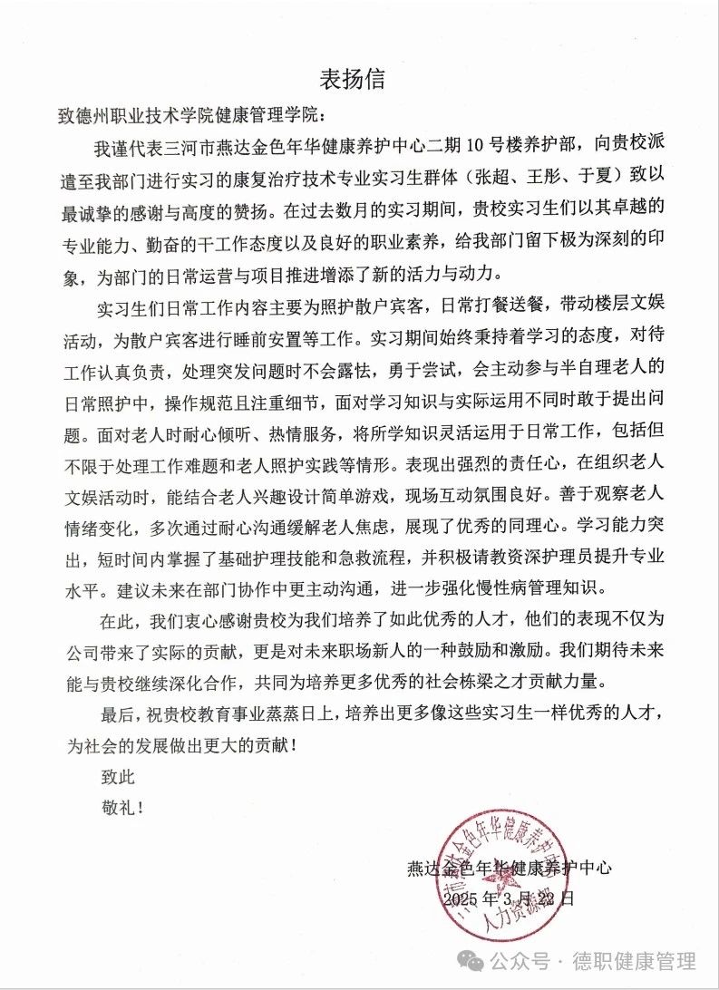 近日,三河市燕达金色年华健康养护中心向米乐mile体育官网发来表扬信,信中对22级康复治疗技术专业学生张超、王彤、于夏在实习期间展现出的专业素养和敬业精神给予高度评价。