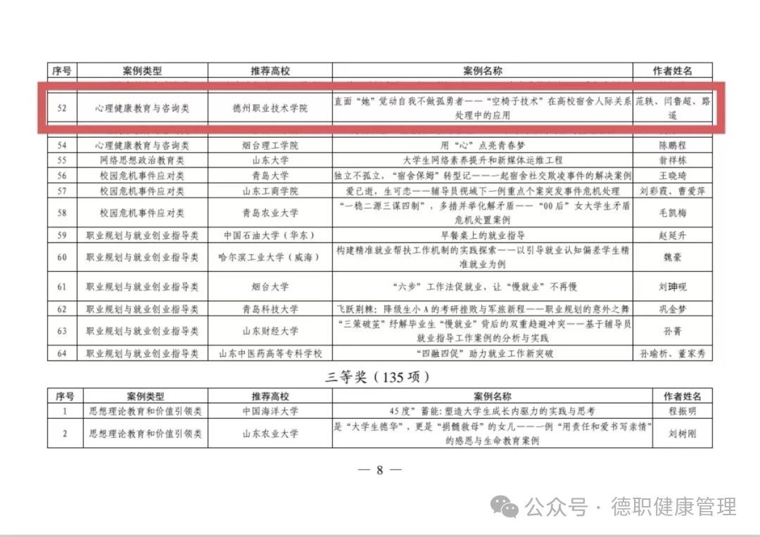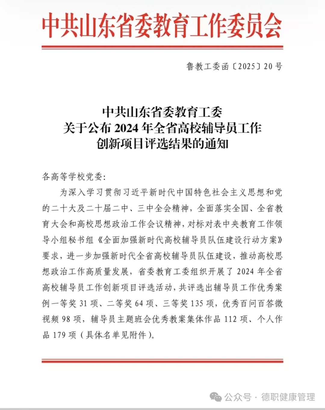 近日,中共山东省委教育工委发布2024年度全省高校辅导员创新项目评选结果,米乐mile体育官网"护航成长"辅导员工作室范轶、闫鲁超、路遥三位教师联合申报的《直面"她"觉动自我不做孤勇者——"空椅子技术"在高校宿舍人际关系处理中的创新实践》案例,在全省百余项申报案例中脱颖而出,成功斩获辅导员工作创新案例二等奖!