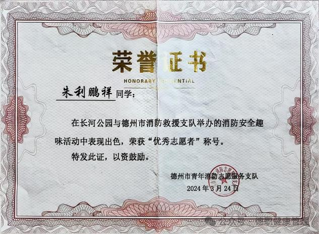 2024年3月长河公园与德州市消防救援支队举办的消防安全趣味活动,荣获“优秀志愿者”;