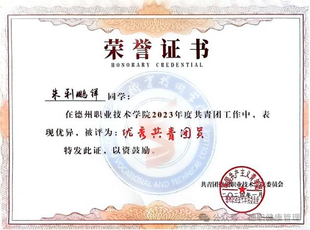 2024年1月2023年度共青团工作中,荣获“优秀共青团员”;