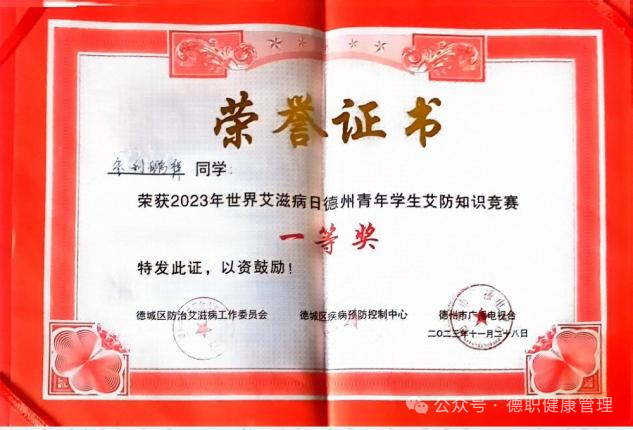 2023年11月世界艾滋病日德州青年学生艾防知识竞赛获得“一等奖”;