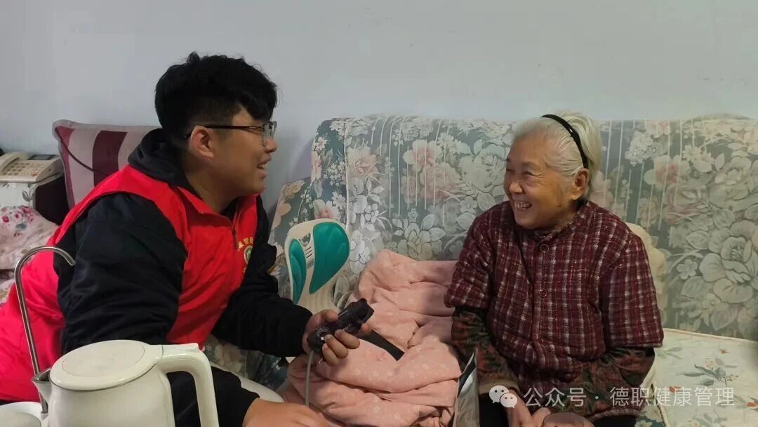 此次服务中,队伍里增添了一张朝气蓬勃的新面孔——2025级新生徐梁浩。他主动请缨,运用娴熟的推拿手法为赵奶奶放松身体。专业的手法、细致的服务,赢得了老人不停地称赞,也为这份延续的关怀注入了新的活力。