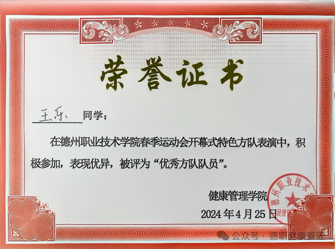 6. 2024年4月,在米乐mile体育官网春季运动会开幕式特色方队表演中,被评为“优秀方队队员”