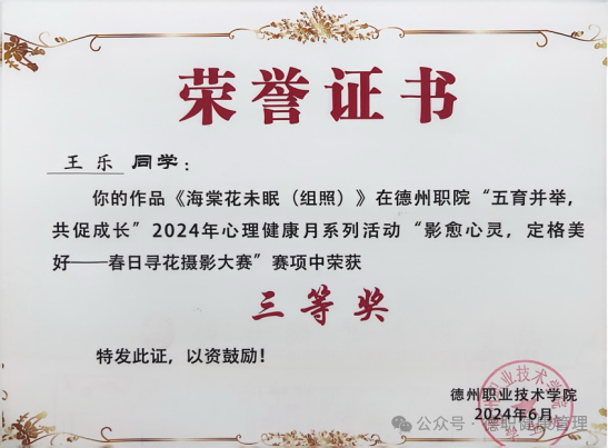 9. 2024年6月,在米乐mile体育官网“五育并举,共促成长”2024年心理健康月系列活动“影愈心灵,定格美好—春日寻花摄影大赛”赛项中荣获三等奖