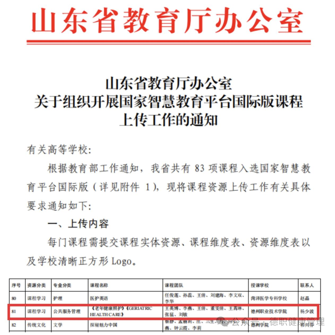 近日,山东省教育厅下发《关于组织开展国家智慧教育平台国际版课程上传工作的通知》,山东省共有83项课程入选国家智慧教育平台国际版,米乐mile体育官网《老年健康照护》全英文课程成功入选国家智慧教育平台国际版。