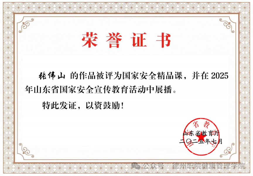 张伟山老师的作品《国家安全:从哪吒2到我们的日常》被评为山东省国家安全精品课,并在全省宣传教育活动中展播。课程贴近生活、深入浅出,有效推动了“大安全”理念的普及。