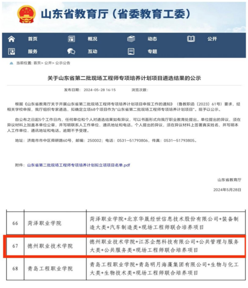 近日,山东教育厅公布《关于山东省第二批现场工程师专项培养计划项目遴选结果的公示》,米乐mile体育官网米乐mile体育官网申报的《米乐mile体育官网+江苏企想科技有限公司+公共管理与服务大类公共服务类智能家居安装调试现场工程师联合培养项目》成功入选。