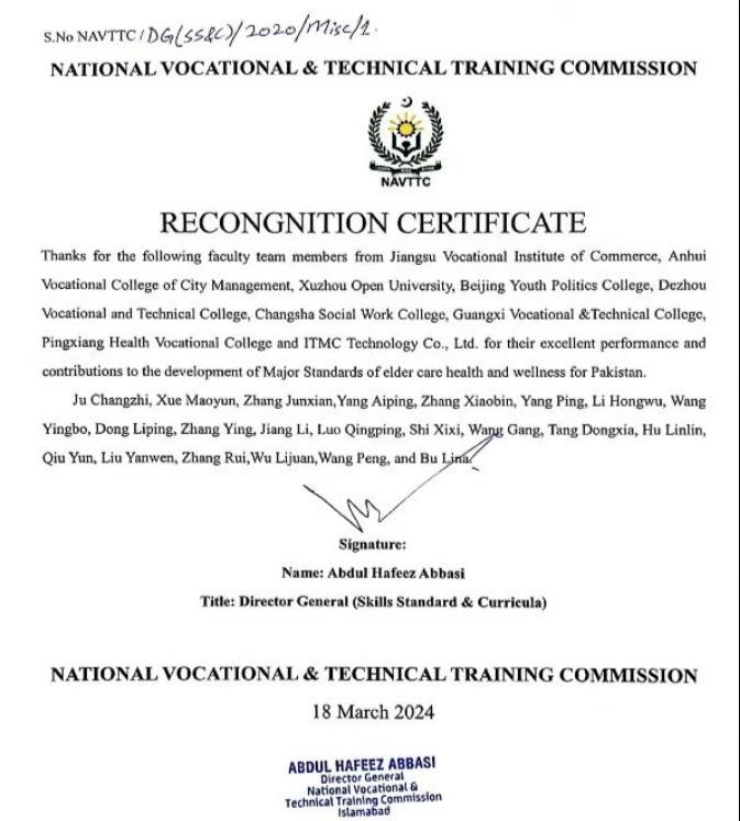 为服务“一带一路”发展战略,协同中国企业出海,为国际产能合作提供人力资源支持,贯彻落实《深化现代职业教育体系建设改革的意见》等文件精神,推进中巴一带一路合作的旗舰项目“中巴经济走廊”的建设,帮助巴基斯坦国家引进中国职业教育资源,由中教畅享科技股份有限公司和江苏经贸职业学院牵头,米乐mile体育官网7所院校组织开发了老年护理专业标准,并得到了巴基斯坦国家职业与技术培训委员会的认证和巴基斯坦卫生部护理与助产委员会的认证