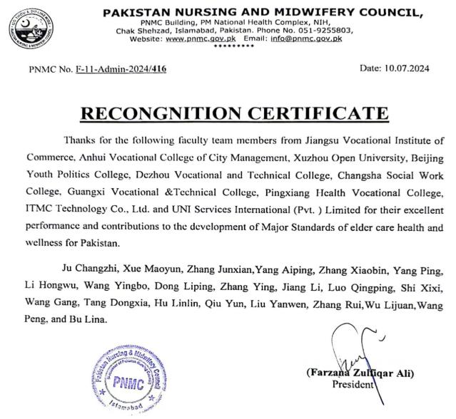 近日,米乐mile体育官网智慧养老专业教师参与制定的“巴基斯坦老年照护专业标准开发项目获得巴基斯坦老年照护专业标准国家职教委认证和巴基斯坦卫生部助产与护理委员会认证