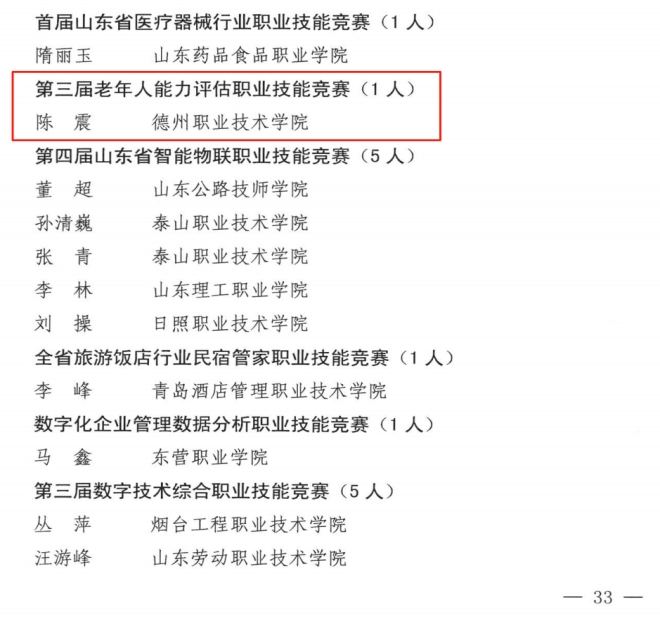 陈震老师参加了2024年山东省“技能兴鲁”职业技能大赛——第三届老年人能力评估职业技能竞赛职工组的比赛。此次竞赛分初赛、复赛两个环节。初赛时,陈震老师沉着应对、熟练操作,圆满完成理论考试和技能实操项目,并顺利进入决赛。决赛现场竞争激烈,陈震老师凭借过硬的专业知识,按照老年人能力评估师(三级)的国家职业标准及老年人能力评估规范中的要求细致地完成比赛操作项目,荣获该项比赛一等奖第1名的好成绩,山东省人力资源和社会保障厅授予陈震老师“山东省技术能手”荣誉称号。