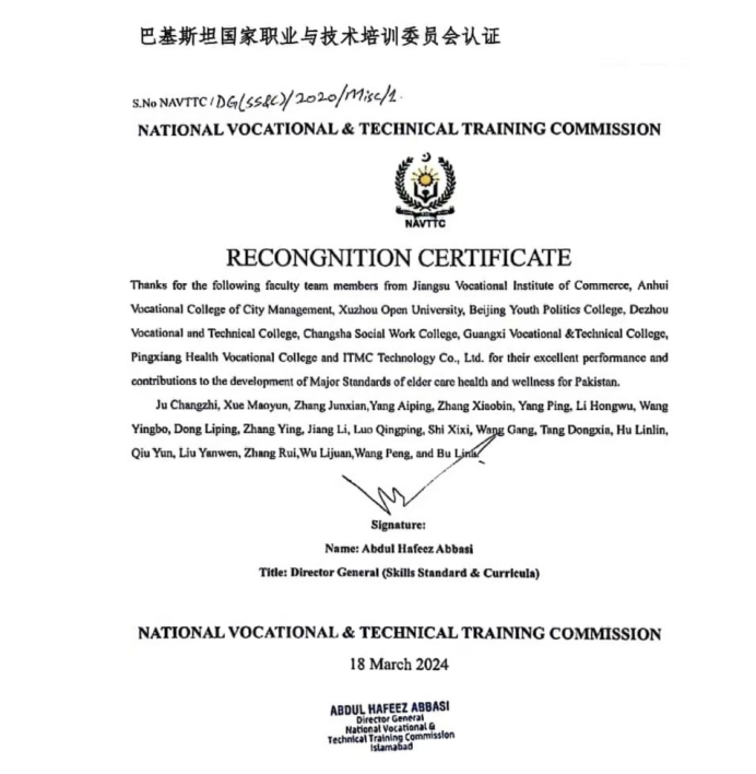 依托家政产业园成熟的运行模式与标准,学院进一步拓展服务半径,牵头制定非洲塞舌尔国际家政标准,参与制订巴基斯坦老年照护标准,并开发“中文+职业技能”资源包。