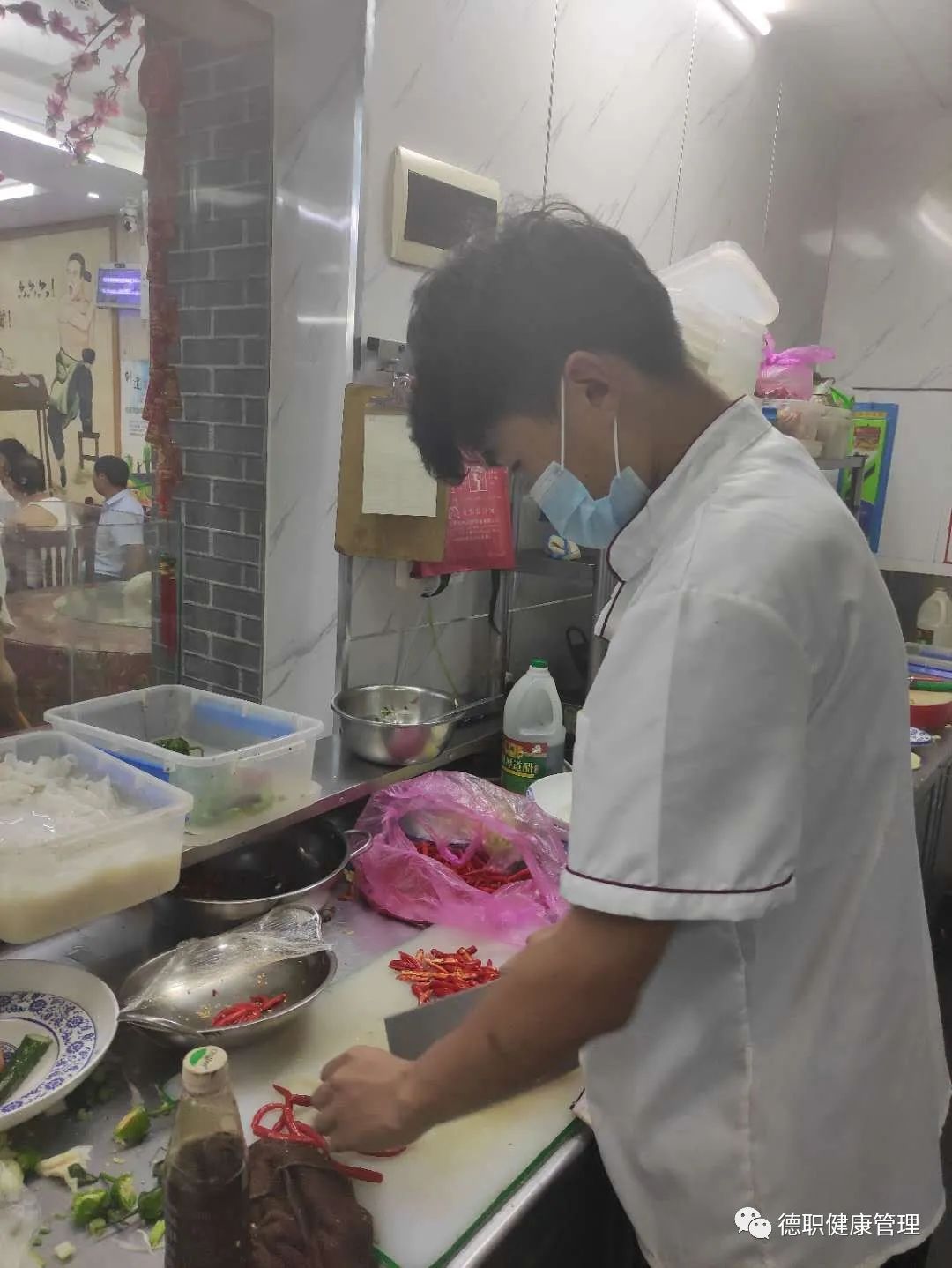 在厨房工作,必须服从厨师长和领班的管理。进入厨房必须按规定着装,佩戴工作帽,保持仪表、仪容整洁,洗手后上岗工作。现在我担任的是厨房的案子,每天的工作就是,切菜,配菜,上灶台。豆制品提前泡水,切好的菜品,必须严格要求,保证菜品的新鲜,生熟食品的分开放置,封保鲜膜。配菜也讲究技巧,先炒什么菜,后炒什么菜,每天晚上仔细核对菜单,需要购买什么菜品,大概需要买多少,清理灶台,做好厨房卫生,喷洒酒精消毒,两天清理一次油烟机。