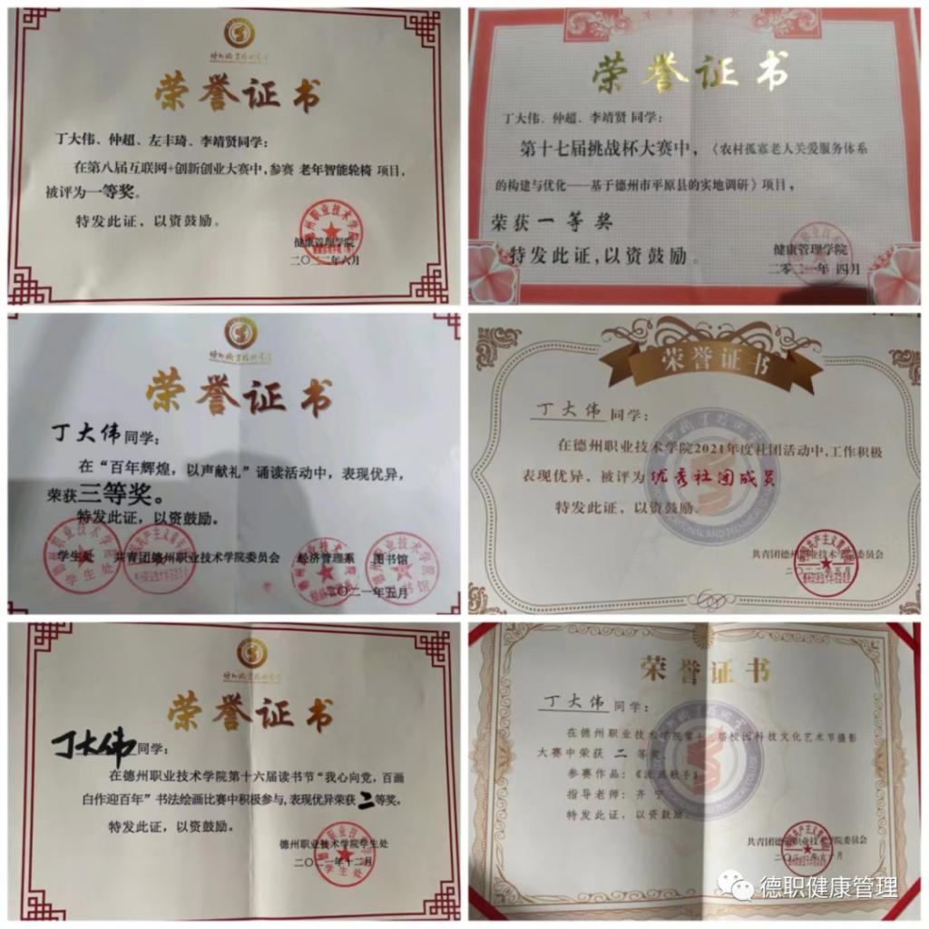 “苟日新,日日新,又日新”,总书记呼吁青年要走在创新创造的前列,争做锐意进取、开拓创新的时代先锋,丁大伟牢记于心,并积极地将理念付诸于行动。获得了第八届“互联网+创新创业大赛”一等奖,“低碳环保节能减排”全国初赛一等奖,十六届读书节书法绘画比赛二等奖,十三届校园科技文化艺术节摄影大赛二等奖等。在创新类赛事中她不断克服困难,一次次突破自己。